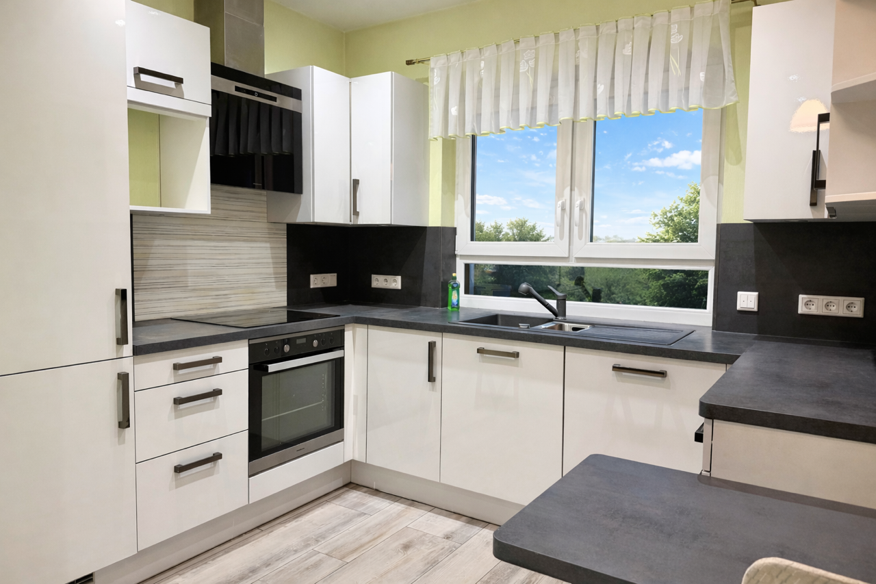 Ein Schlafzimmer sowie ein separates Kinder- oder Arbeitszimmer schaffen individuelle Rückzugsorte. Die Küche ist mit einer modernen Einbauküche ausgestattet und fügt sich funktional und harmonisch in das Wohnkonzept ein.