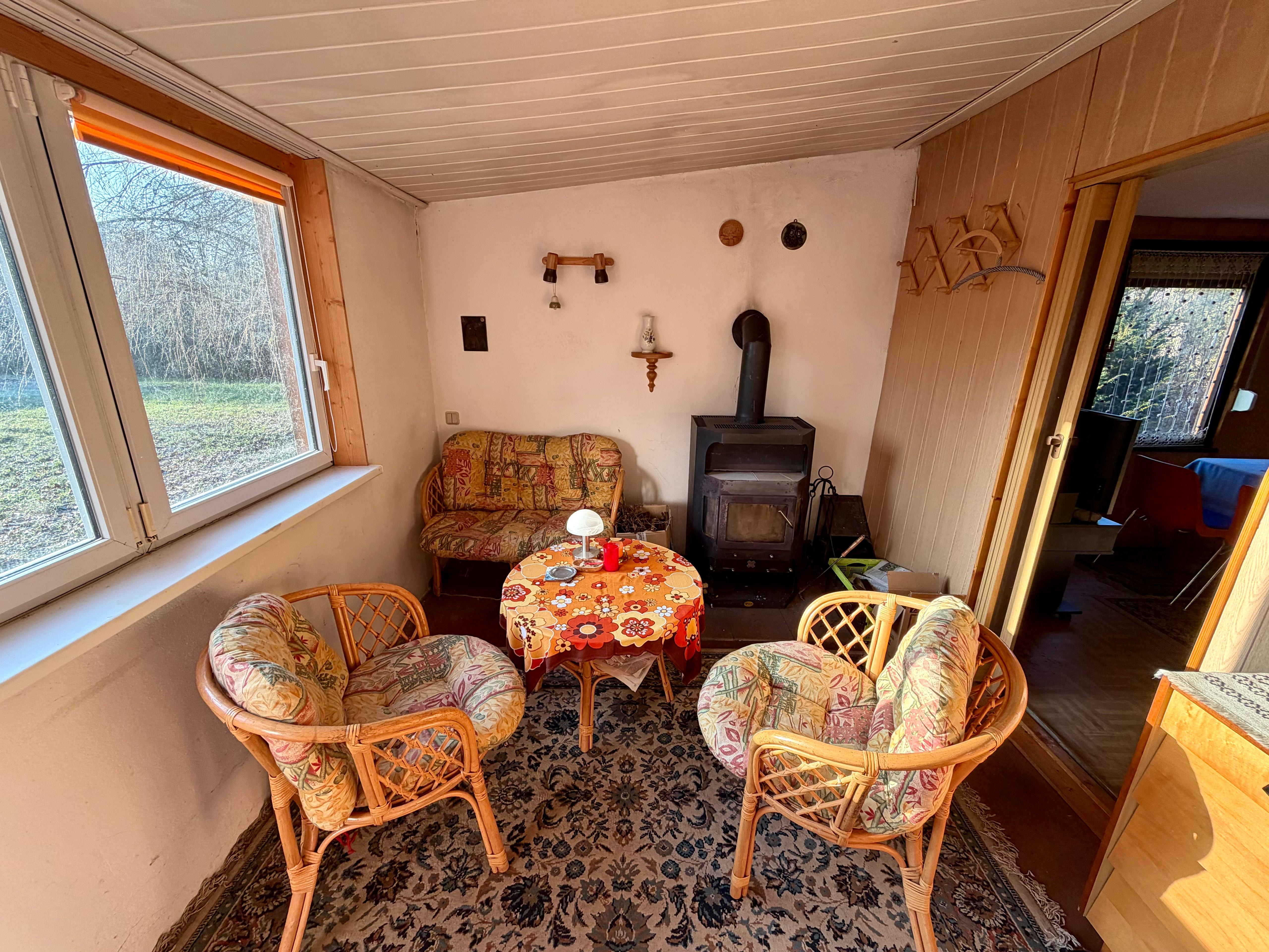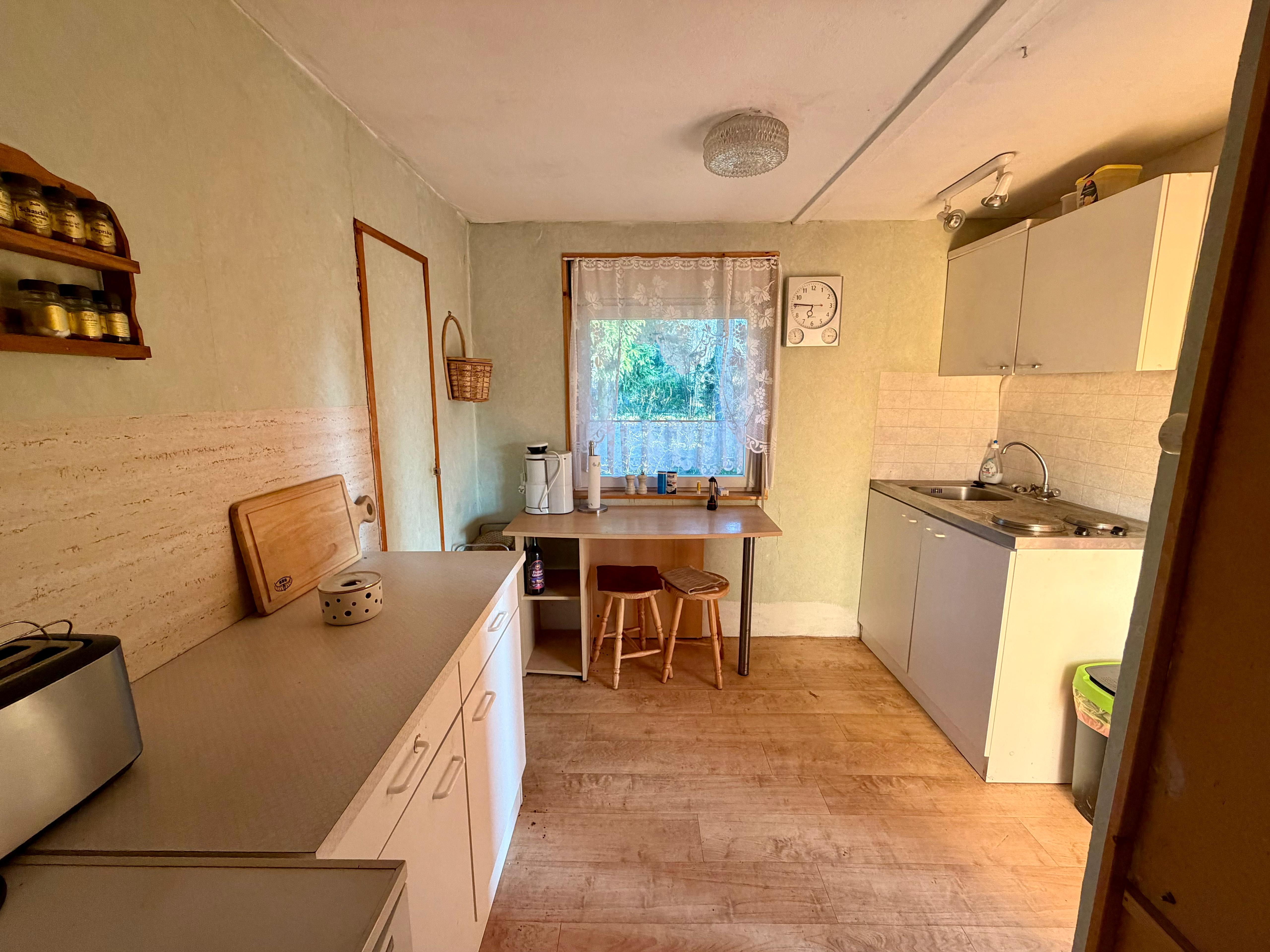 Ein besonderer Wohlfühlfaktor ist der Kaminofen in der Veranda, der auch an kühleren Abenden eine warme, behagliche Atmosphäre schafft. Die Küche ist ausgestattet mit zwei Elektrokochplatten, Spüle und Kühlschrank – funktional und vollkommen ausreichend für entspannte Urlaubstage.