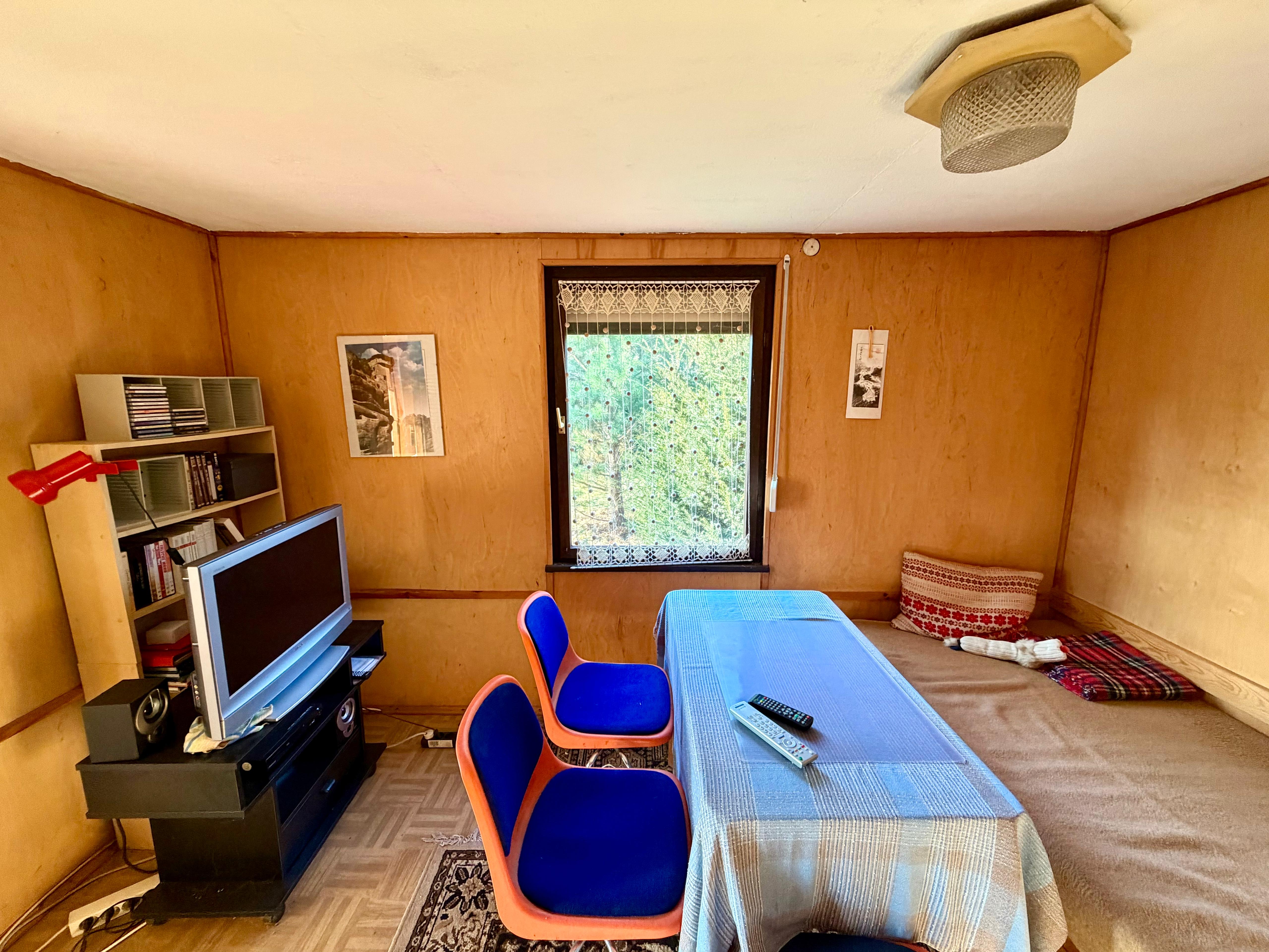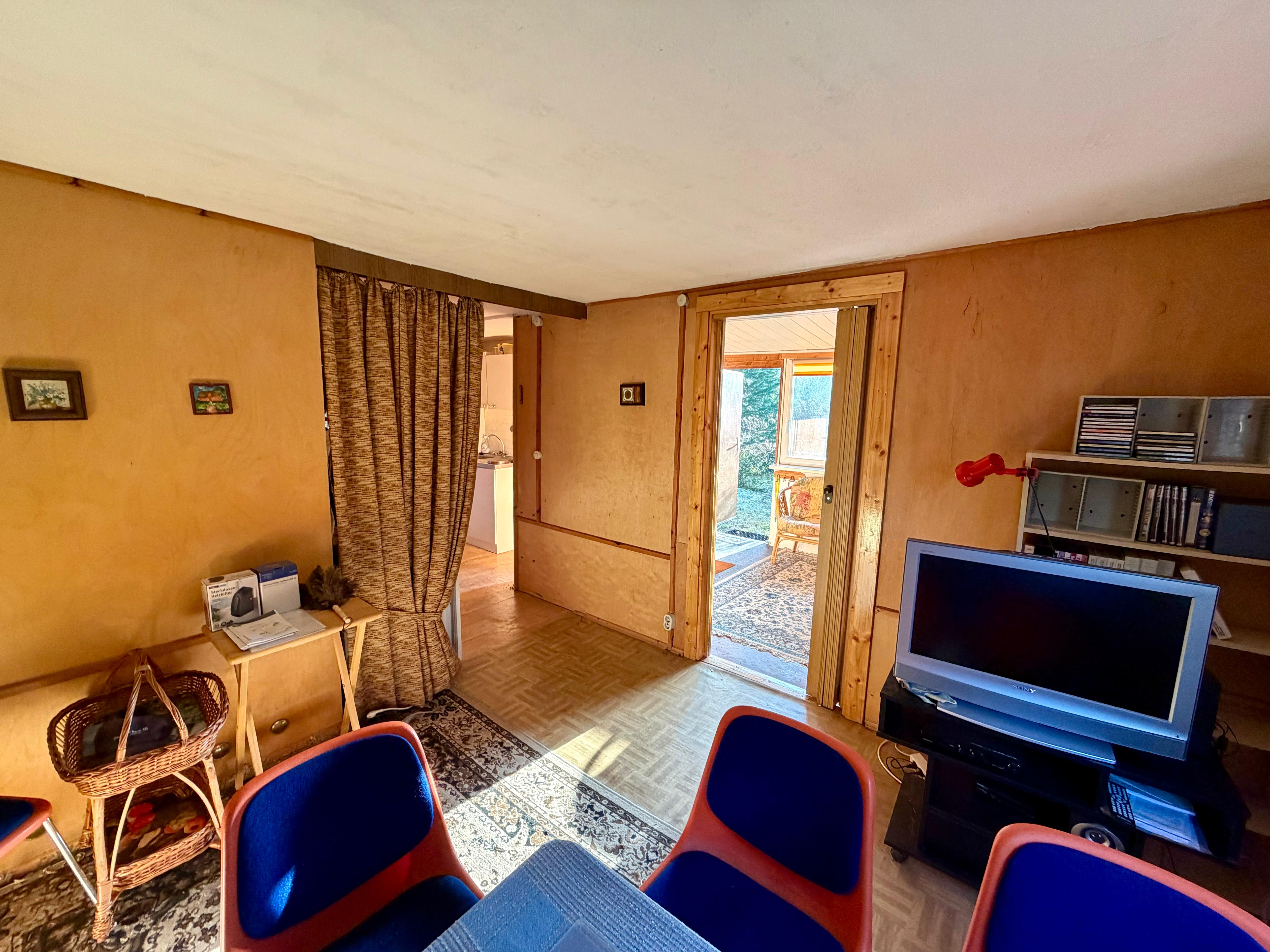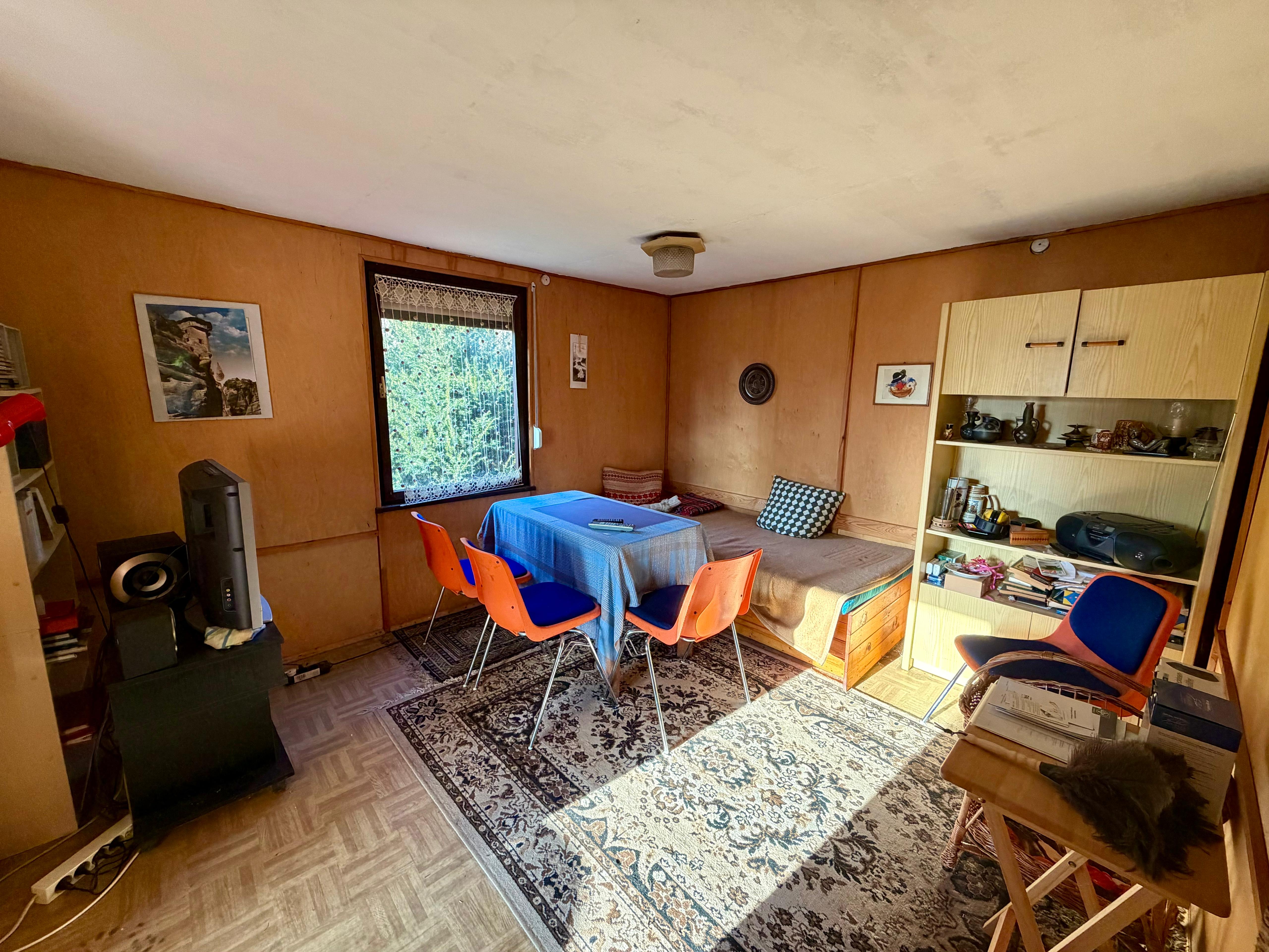 Der eingeschossige Sommerbungalow aus den 1980er Jahren überzeugt durch seine klare, funktionale Struktur und seinen authentischen Charakter. Mit einer Wohnfläche von ca. 39 m² ist er bewusst kompakt gehalten – ideal für Wochenenden, Ferien und entspannte Auszeiten fernab des Alltags. Große Bäume, viel Grün und die angenehme Abgeschiedenheit schaffen eine Atmosphäre, in der man ankommt und durchatmet.