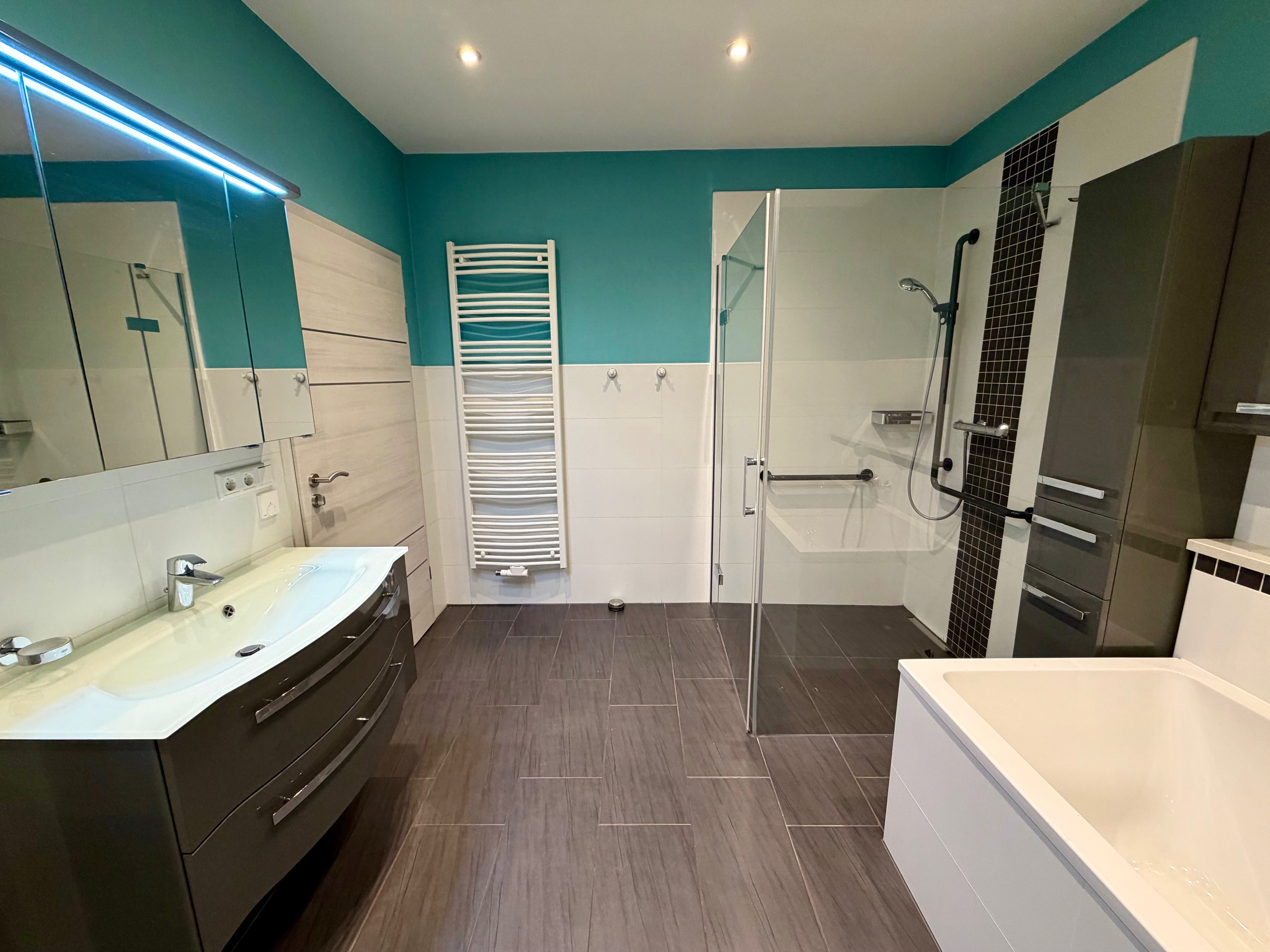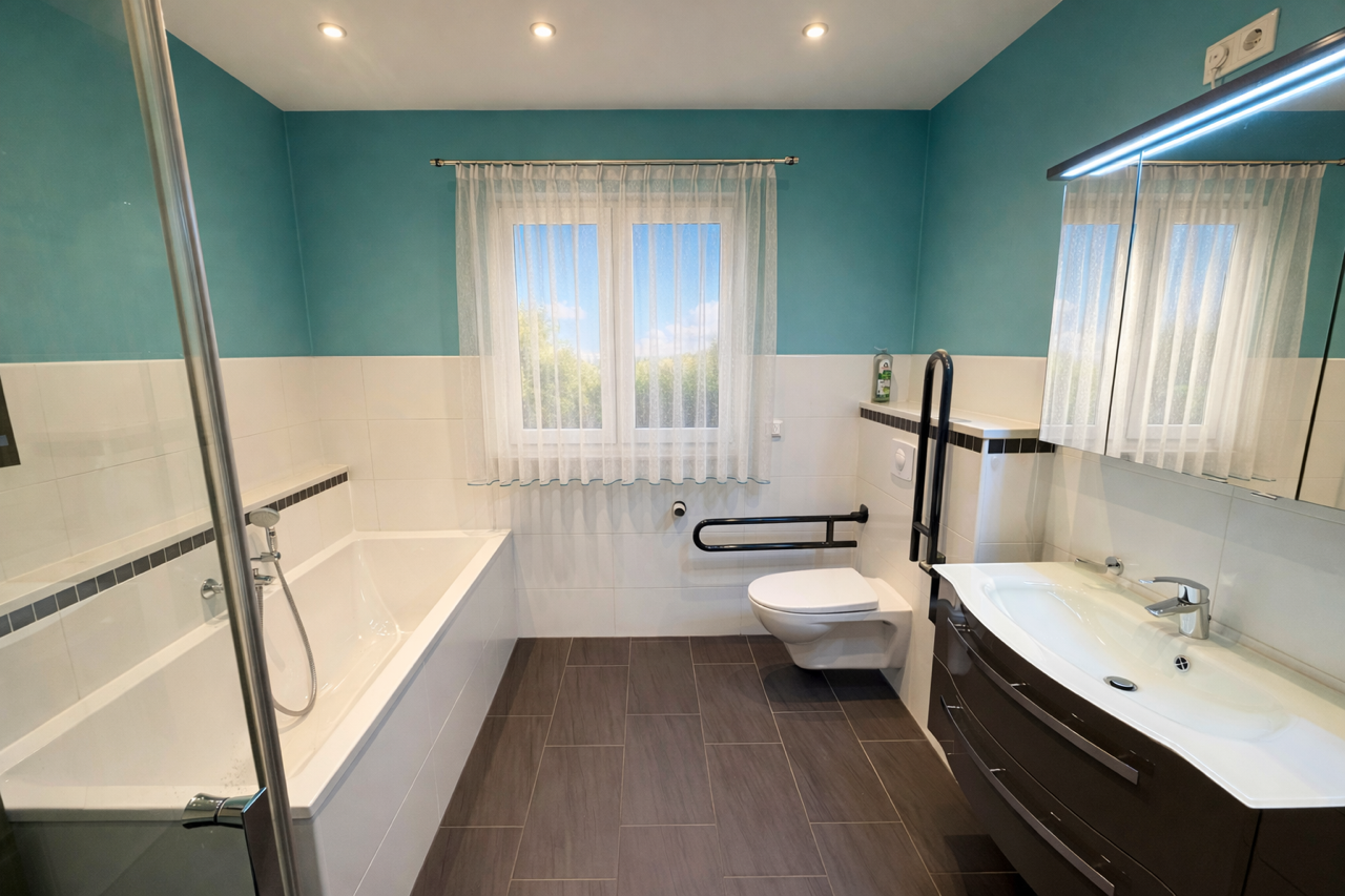 Das zeitgemäß geflieste Wannen-Duschbad bietet sowohl Komfort als auch Flexibilität im täglichen Gebrauch. Der Hausanschlussraum beherbergt die Heizungsanlage, Anschlüsse für Waschmaschine sowie Trockner und bietet zusätzlich praktischen Platz für Lagerung, Vorräte oder Haushaltsgeräte.