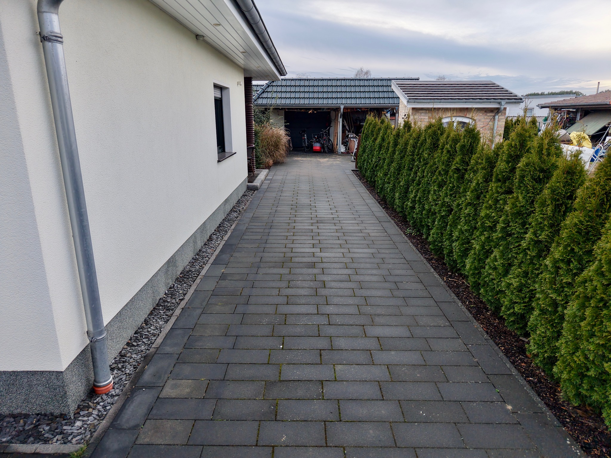 Der Außenbereich ist funktional und gepflegt angelegt: gepflasterte Wege, eine mit Doppelstegplatten überdachte Terrasse (ca. 20 m²), ein massiv gemauertes Nebengelass mit Abstellraum, Toilette und Handwaschbecken, eine Garage für einen Pkw mit elektrischem Rolltor sowie zwei gepflasterte Pkw-Stellplätze.