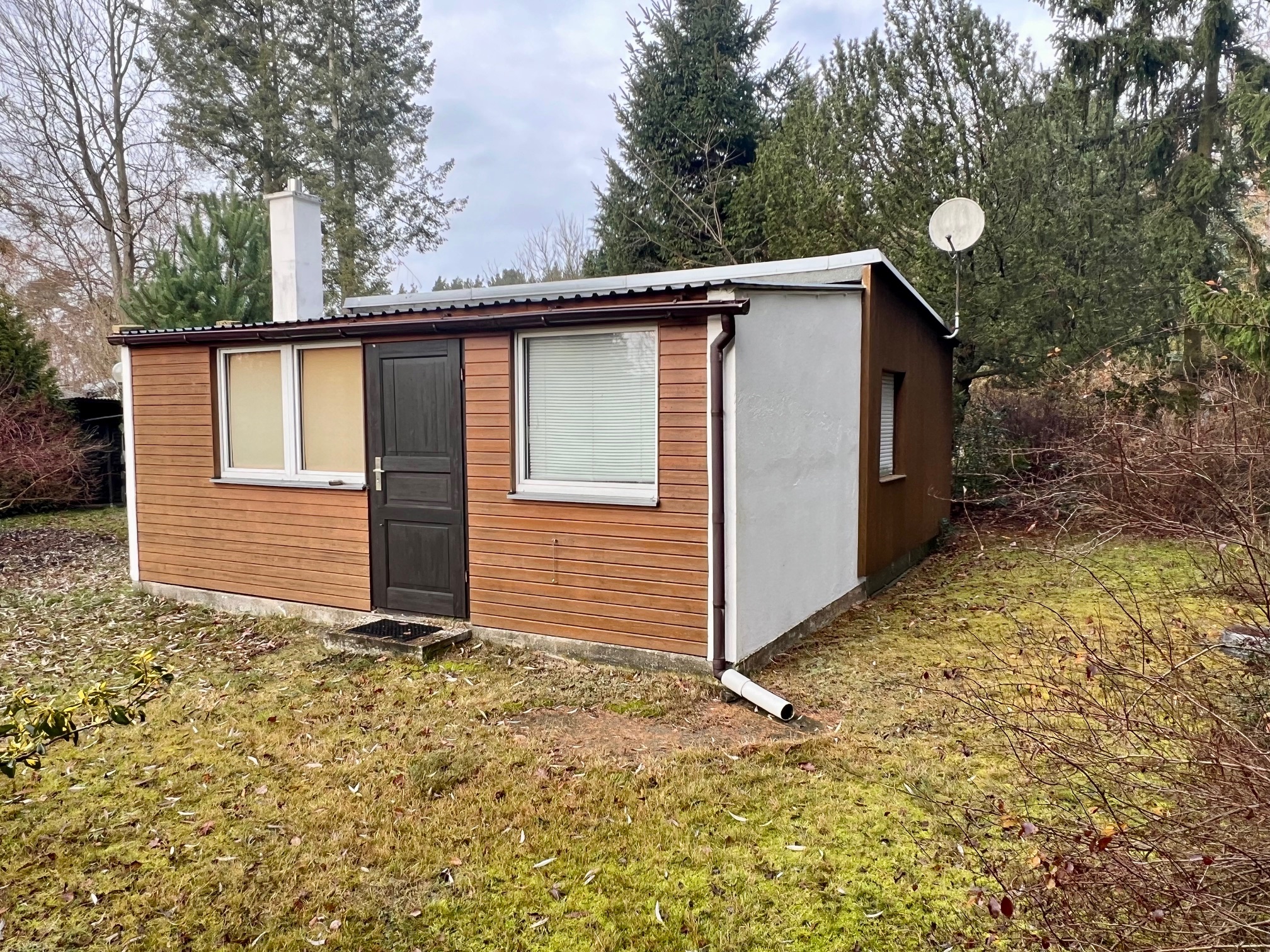 Der Bungalow ist in isolierter Holzständerbauweise auf Betonfundament errichtet, das Dach ist mit robusten Metallplatten gedeckt. Die einfachen Holzfenster unterstreichen den ursprünglichen Charme eines klassischen Wochenendhauses.